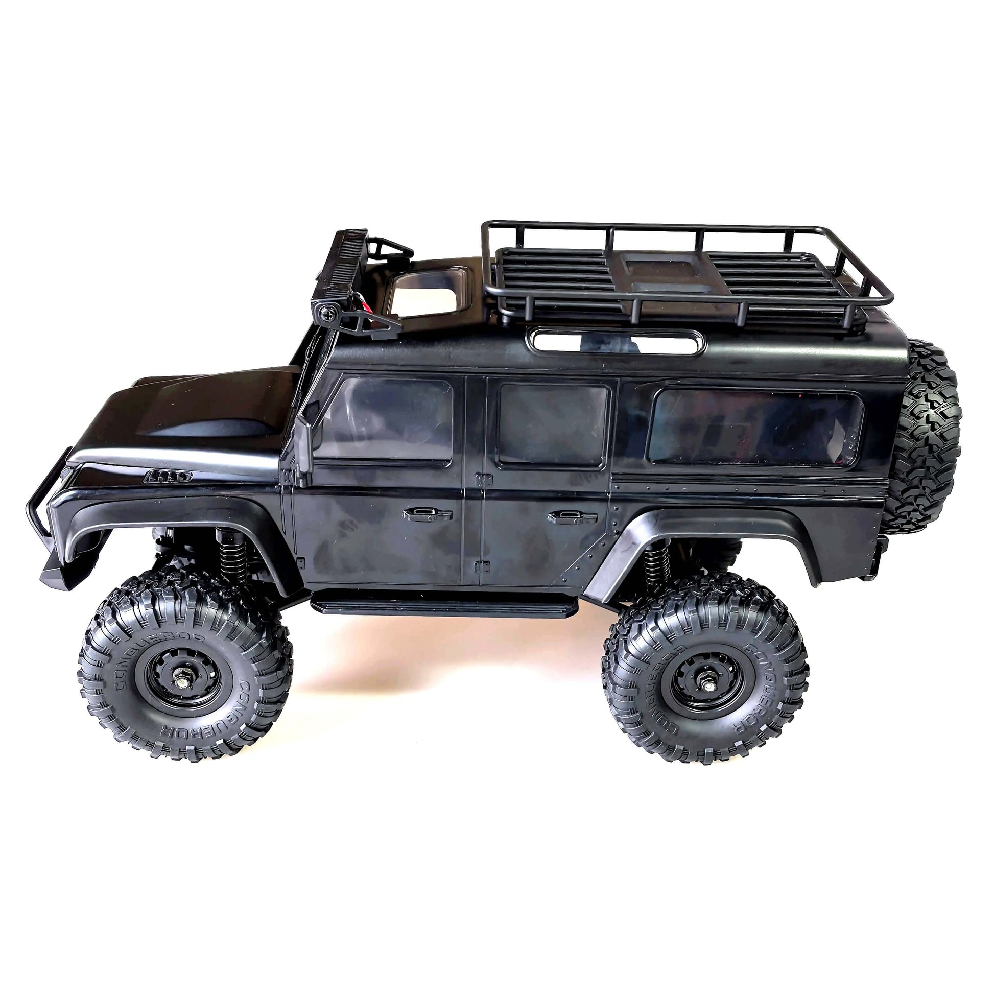 The four-wheel drive system, combined with front and rear independent suspension and high-precision ball bearings, ensures stable crawling, improved traction, and long-lasting performance. LED headlights, rear lights, and a colourful roof light bar add scale realism for day or night driving.