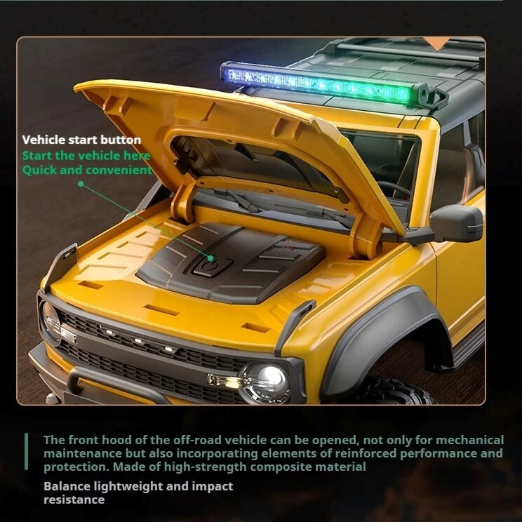 The four-wheel drive system, combined with front and rear independent suspension and high-precision ball bearings, ensures stable crawling, improved traction, and long-lasting performance. LED headlights, rear lights, and a colourful roof light bar add scale realism for day or night driving.